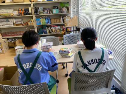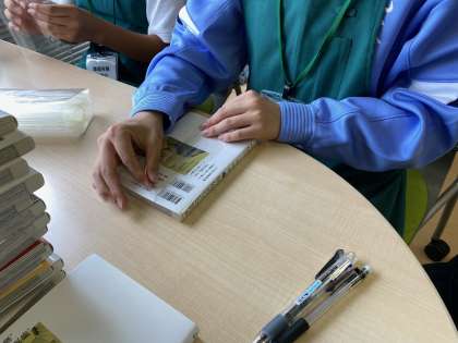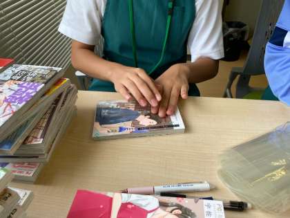 さきしま書店さんでフィルムがけのお仕事を体験させていただいている様子です。丁寧にすることを心がけて黙々と作業に取り組んでいました。