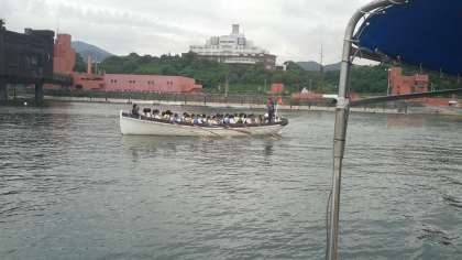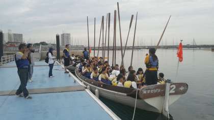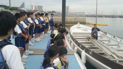 カッター訓練、無事終了。薄曇りで波、穏やかで絶好のコンディションでした。みんなで協力して海へ漕ぎ出しました。
