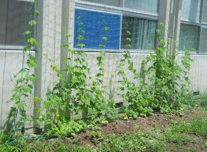 梅雨の合間の青空。北館南側の緑のカーテンのごーやがだいぶ大きくなりました。1階の窓をおおうまでにはまだ少しかかりますが、花が咲き、小さな実もつけ始めました。
