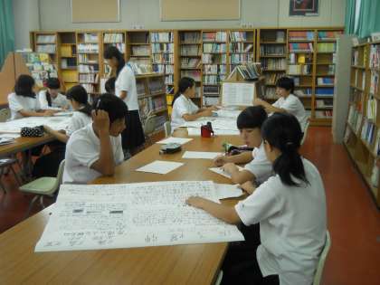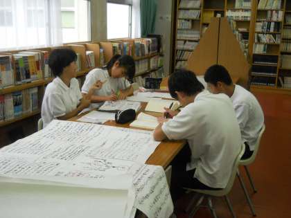 本を借りに来る生徒のうしろでは、2年生が班ごとに平和学習の調べものをしています。