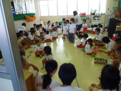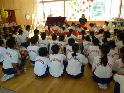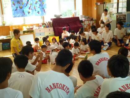 中学生の方が、おそるおそる園児のもとへ。園児の方が積極的です!
