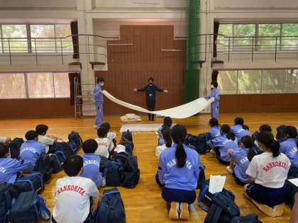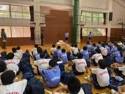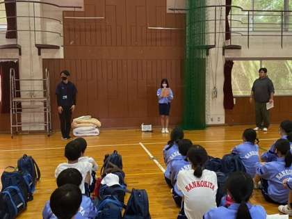 生徒代表からのあいさつのあと、スタッフの方からふとんの畳み方など、館内の説明がありました。
