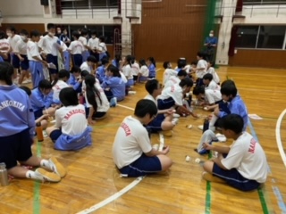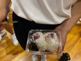 室内オリンピックのあと、夜食におにぎりをもらって食べています。