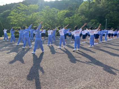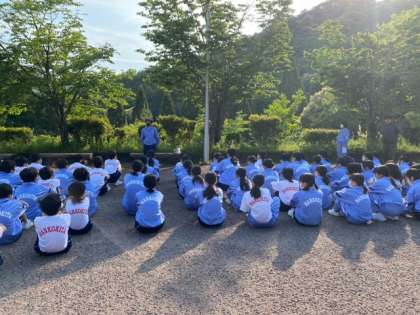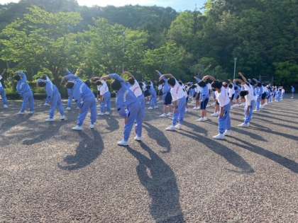 7時につどいの広場に集合し、保健体育の先生指導のもと、ラジオ体操をしました。