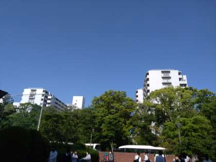 時間よりバスの到着が遅くなったので、この時間の出発となりました。楽しく元気な修学旅行を予見させるような青空です。