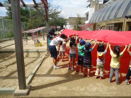 中は、きのみ保育園です。園児たちと一緒になってパラバルーンをしています。