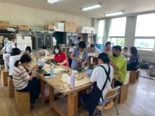 本校には珍しい陶磁器用の窯が校内に設置されており、地域の方が陶芸教室を隔週で開いて活動しています。事前に申し込みをしていた生徒さんがその陶芸教室の地域の方に教わりながら作品を作りました。
