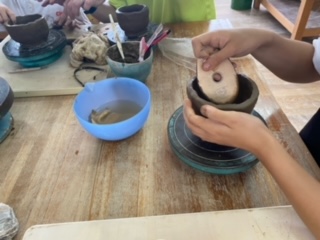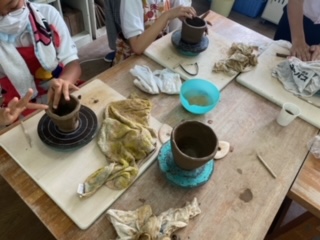 手回しろくろを使って手びねりで器を作るのですが、難しいながらも集中して作っていました。