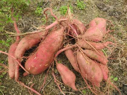 小雨の降る中で植えつけたサツマイモの苗が成長しました。