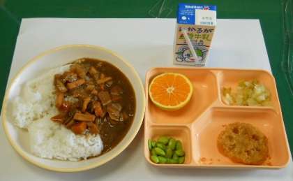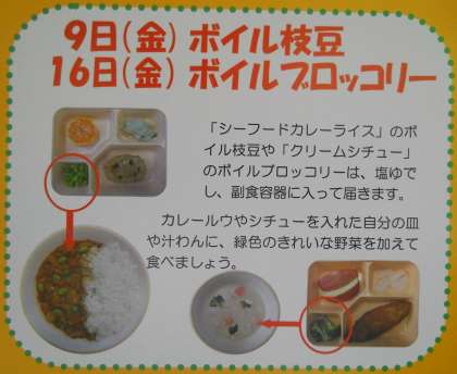 今月から、カレーやシチューなどの一部の具材を色鮮やかな状態で提供できるように、塩ゆでした状態で副食容器に入れて届けられます。食べるときに各自で加えていただきます。今日は枝豆です。