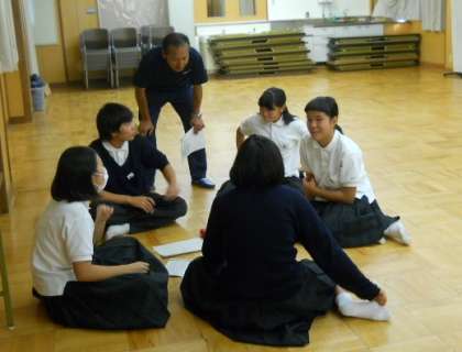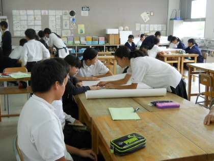 5限の3年生の文化発表会に向けての取組みの様子です。全体劇「マイライフ」の各場面に分かれて、セリフや演技を考えています。美術室では、背景や小道具の分担を決め製作を始めました。