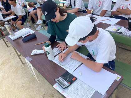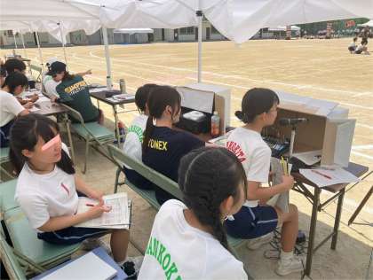 本部席では、生徒会役員が放送を、美化委員が記録を担当して体育大会を進行しています。
