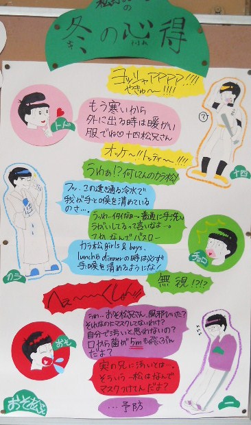 保健室前におそまつ君が登場。冬の生活の心得を伝授してくれています。