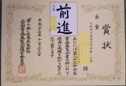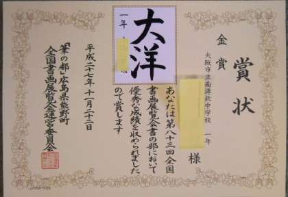 元気アップ書道教室が出展した『第83回全国書画展覧会(書写の部)』の審査結果が届き、全校集会で紹介しました。