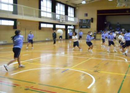 キックベースボール大会のはずでしたが、雨のため体育館でドッジボール大会に変更。男女別、男女混合の3つの部でソフトバレーボールを使いましたが、ボールがホップしたりして迫力あるゲームになりました。