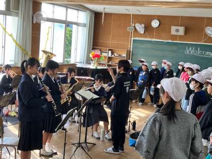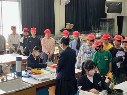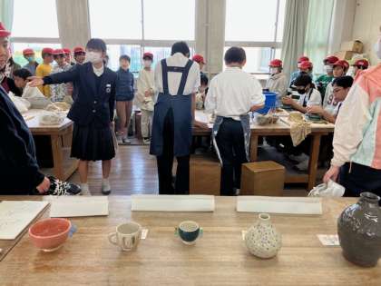 小学生のみなさんは、中学生の先輩たちが説明してくれる各部活動の紹介をしっかりと聞いていました。写真は、吹奏楽部、華道部、美術部陶芸班の活動風景です。
