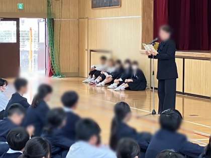 まずは、4月に校長先生からみなさんに「本を読みましょう」と話されたことについて、校長先生ご自身が最近読んだ本の内容を紹介してくださいました。物語の主役はいじめられっ子の中学生タコジロー。ヤドカリのおじさんとの会話を通じて自分自身を受け入れていく過程を描いた物語で、タコジローの気持ちが楽になって自己肯定感を高めていくストーリーだということでした。