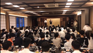 宮浜グラウンドホテルに予定通り18時半ごろに到着しました。入館式を行い、夕食をとっています。美味しそうに食べています。