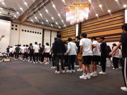 新聞紙を折ってその上に乗る「ペーパーピーポー」や、「言う事一緒、やること一緒」など、修学旅行委員進行による身体を使ったゲームで盛り上がりました!