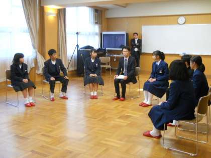 4日(金)、高橋区長に替わり4月から就任される西原新住之江区長と南港北・南中学校の生徒会役員との意見交流会が行われました。会場は南中の多目的室。両校合わせて7名の生徒とアットホームな意見交換を行いました。