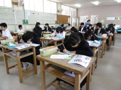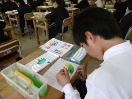 写真左と中は1年1組の美術の授業。色の性質の学習です。
