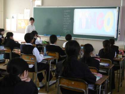 写真右は1年2組の英語の授業。昨年度末に整備された短焦点プロジェクターとスクリーンを使用し、アニメーションビデオを取り入れた英語の口慣らしの練習です。体を動かしリズムに合わせて発音しよう。
