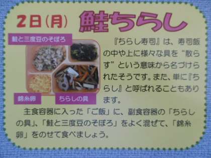 鮭ちらし(ちらしの具、鮭と三度豆のそぼろ、錦糸卵)、