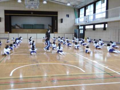 左は1年1・2組の体育の授業。授業の最初はいつも補強運動です。手を抜かずにしっかりやることで、体力調査で全国平均を上回る成績を上げています。