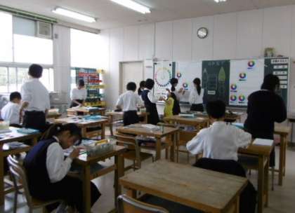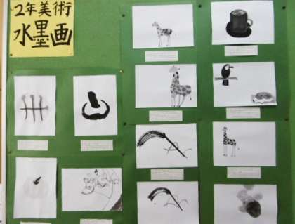 中と右は2年生の水墨画と1年2組の美術の授業です。色のグラデーションをはみ出さずにていねいに。完成したら前にはりに来ます。