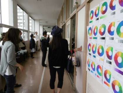 左は1年生の廊下の様子です。美術の作品がありますね。