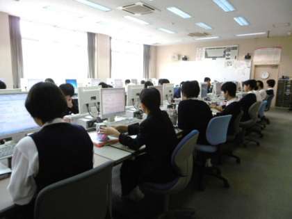 中は3年3組の技術の授業。パソコン教室で半導体の学習です。目に見えない電気は難しい!
