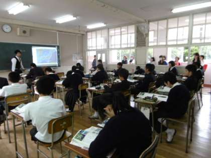 右は2年3組の社会科です。昨年度末に整備されたプロジェクターを使って、日本の地形の特徴を学習しています。