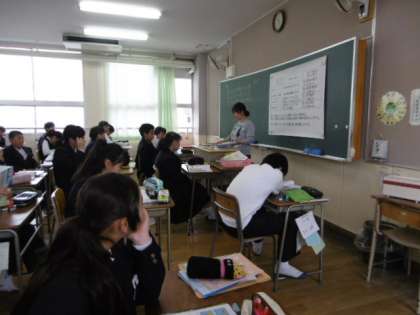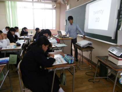 3限、1年1組の英語の授業では数字の発音の練習です。CDに合わせて、One,Two,Three・・・しっかり聞いて発音しよう。