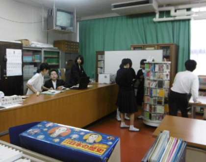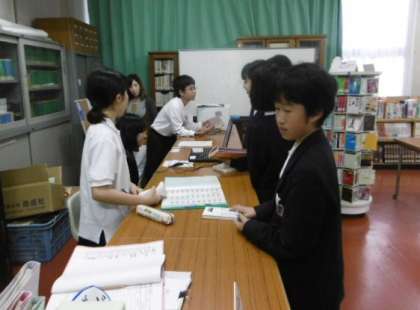 今日から図書委員も昼休みの活動開始。図書館補助員さんと一緒に図書室開館です。本の貸し出し作業はバーコードリーダーをかざすだけ。ピッとなればOK。簡単ですね。
