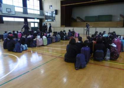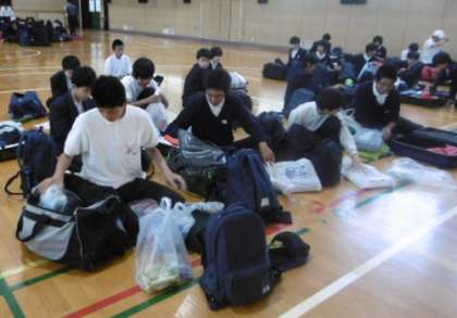 明日13日からの修学旅行に備えて3年生の事前指導を行いました。荷物の点検や集合隊形や活動班の確認など準備はばっちりです。