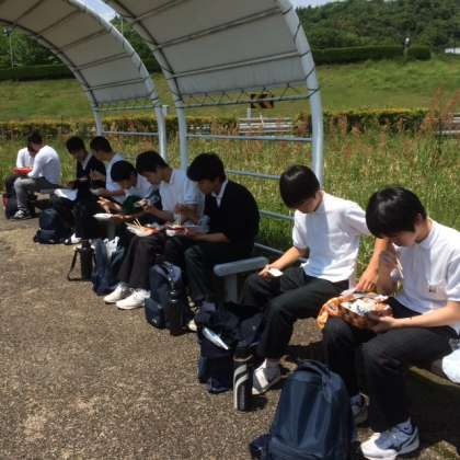 福山SAで昼食。朝が早かったのでお腹ペコペコ。みんなで外で食べるお弁当の味は格別です。12時前には出発し、広島平和記念公園に向かいます。