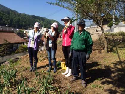 収穫した玉ねぎを持って、はい、チーズ。お昼ご飯に使います。