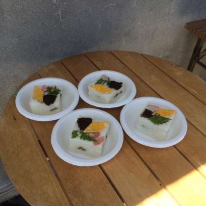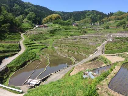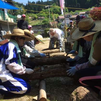 日本棚田100選の一つ「井仁の棚田」です。その中にある農家では、しいたけを原木に植え付け作業をしました。お昼は自分たちで作った一合寿しです。