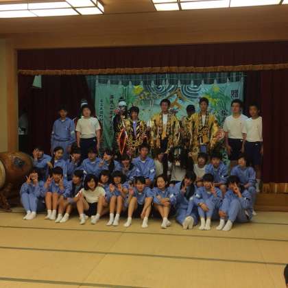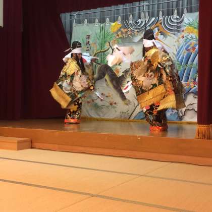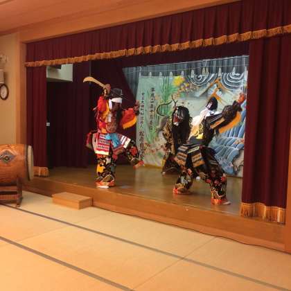 夕食後、安芸太田の伝統神楽を継承する松原神楽団の「塵倫」を鑑賞しました。豪華な衣装と迫力ある演技にびっくりです。