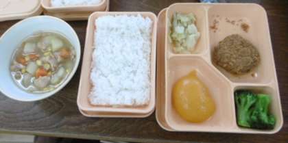 チキンポトフ、ミンチカツ、キャベツのピクルス、黄桃缶詰です。