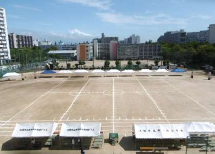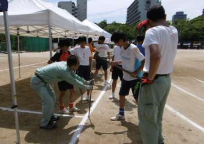 机・いすを並べ、ライン引き、入・退場門の設営、くい打ちと、暑い中、よく働いてくれて、短時間で立派な会場が完成しました。