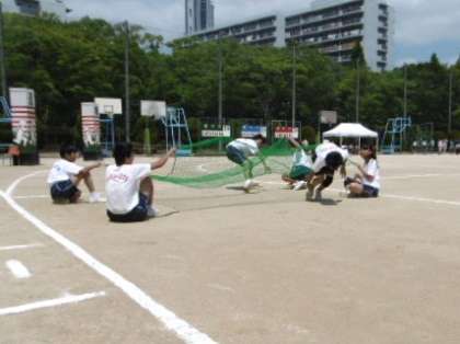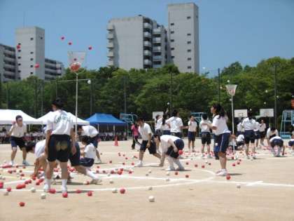 下は、玉入れ。1年から3年のそれぞれ1組、2組、3組が一つのチームとなって競い合います。