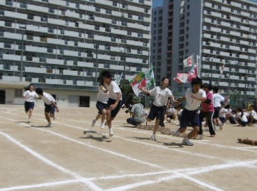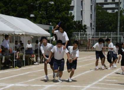 中と下は3年生学年種目「全員リレー」。200m走でスタートし、クラス全員がバトンをつなぎ、ムカデや二人縄跳び、騎馬走などをはさみ、200m走でゴールします。走力だけでなくクラスのチームワークがものをいう競技です。優勝は3組でした。