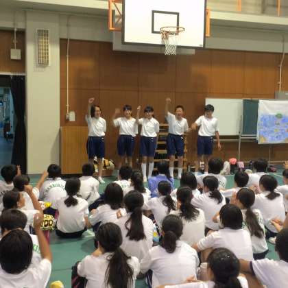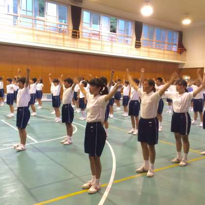 生徒宣誓と活動班の応援パフォーマンスの後のプログラム1番はお約束のラジオ体操です。