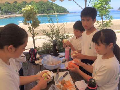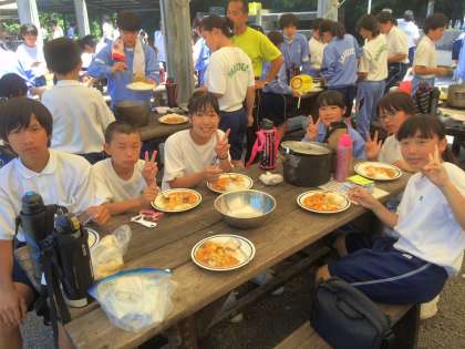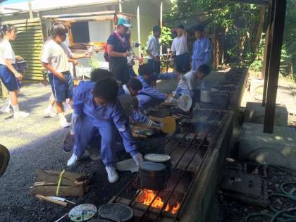 野外炊飯です。全員で協力してカレー作り。野菜を切って、火を起こして・・・