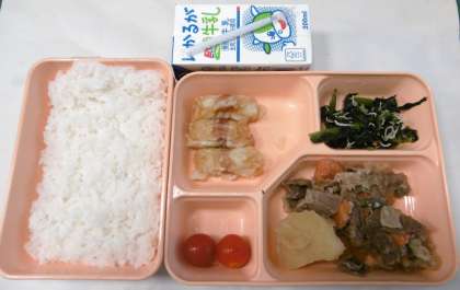 9月13日の給食の献立は、肉じゃが、ちくわの天ぷら、小松菜とじゃこのおひたし、プチトマトでした。