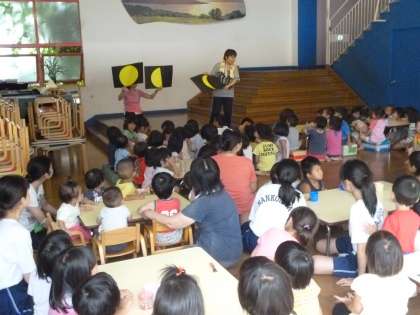 中)きのみ保育園です。園児にまじって「十五夜」にまつわるお話を聞いています。このあと、丸めただんごをいただいたとか。