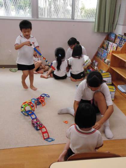 右)ポートタウン保育園です。仲良く遊んでいますが、園児たちのエネルギーにたじたじの場面も。