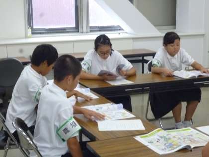 左)住之江区役所です。会議室で、防災のパンフレットをどうしたらもっとたくさんの人に読んでもらえるか、意見交換です。