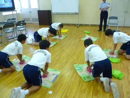 右)住之江消防署です。消防と言えば消火と救急。心肺停止の時はAEDが来るまでひたすら胸骨圧迫と人工呼吸を繰り返します。正しい位置をしっかり押さないとだめです。